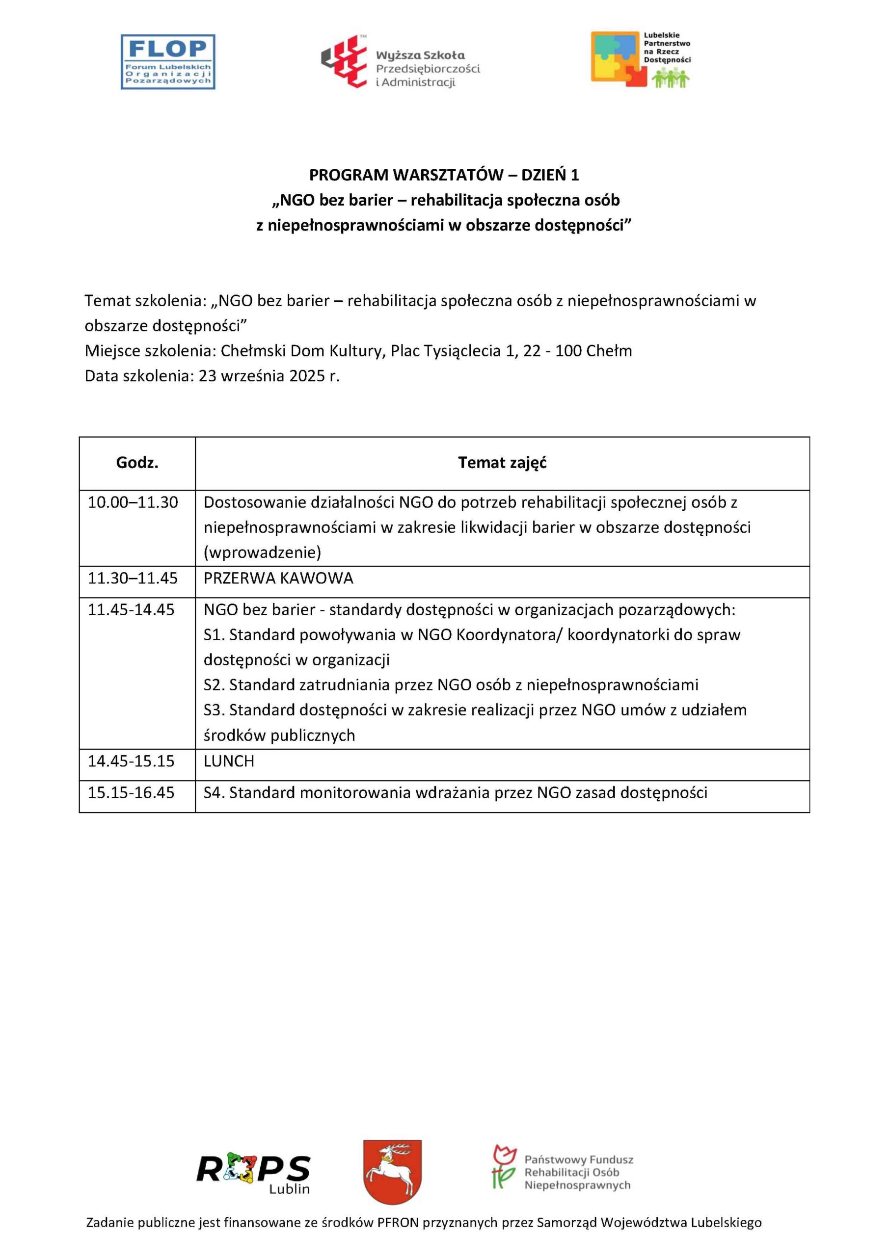 „NGO bez barier – rehabilitacja społeczna osób z niepełnosprawnościami w obszarze dostępności”: 16 godz., 16 os.