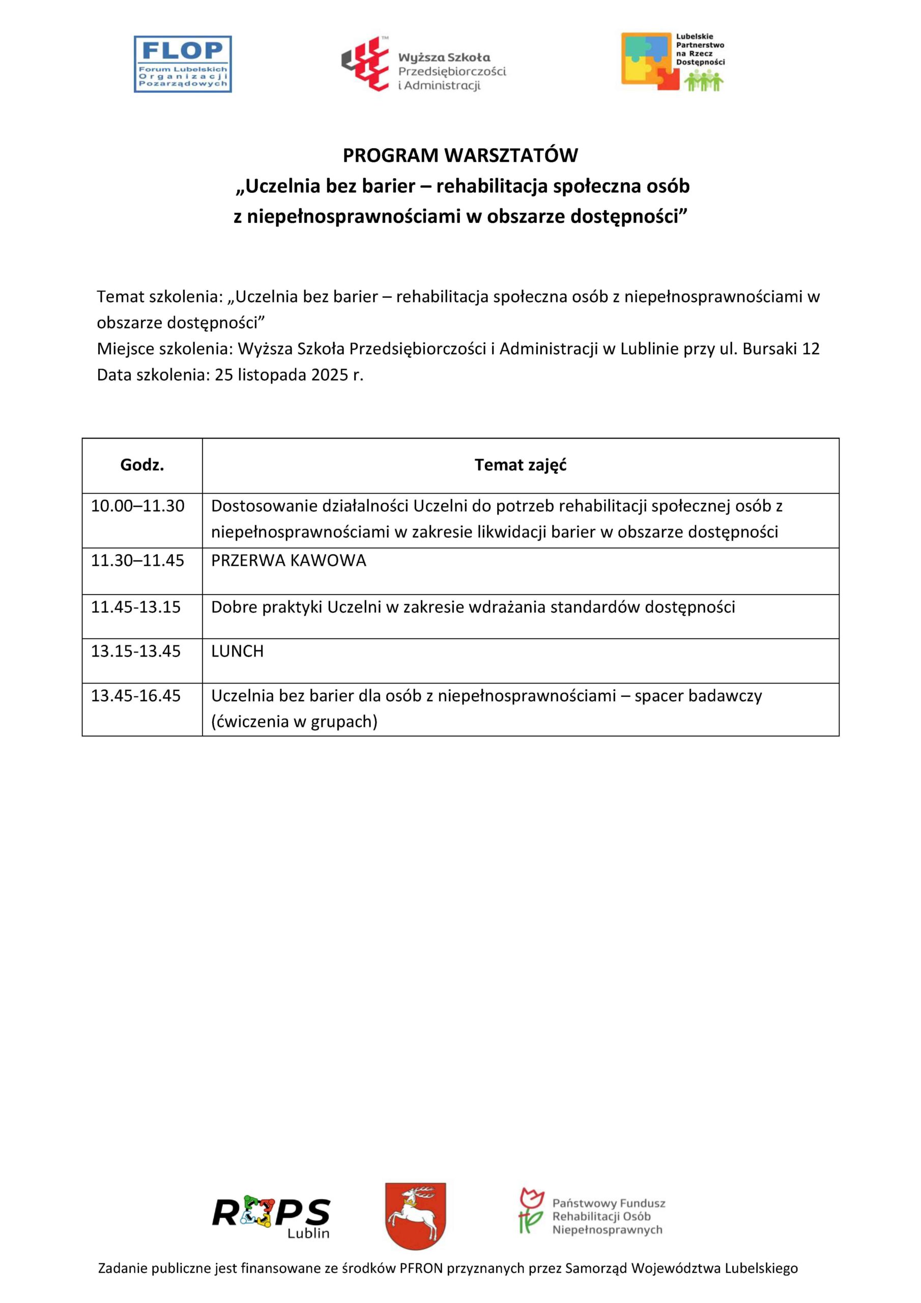 „Uczelnia bez barier – rehabilitacja społeczna osób z niepełnosprawnościami w obszarze dostępności”: 16 godz., 16 os. Dwudniowe warsztaty odbędą się w dn. 25 i 27 listopada 2025 r. w Wyższej Szkole Przedsiębiorczości i Administracji w Lublinie przy ul. Bursaki 12, sala 223.