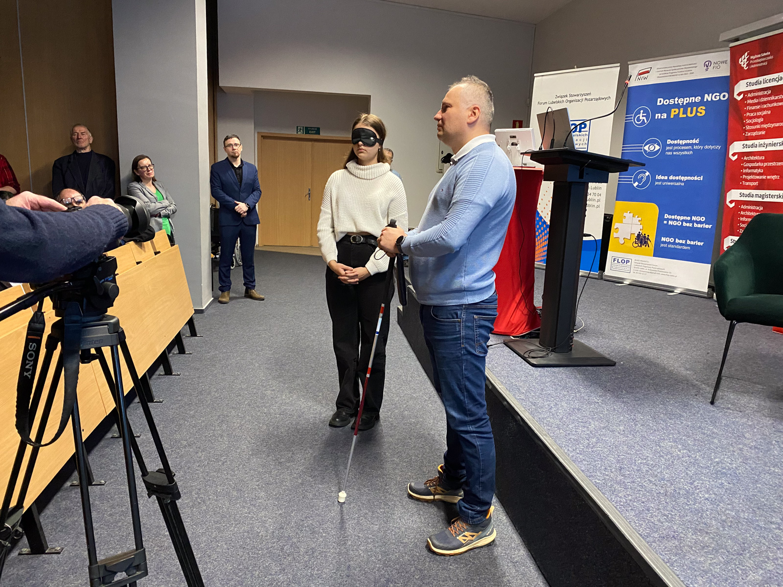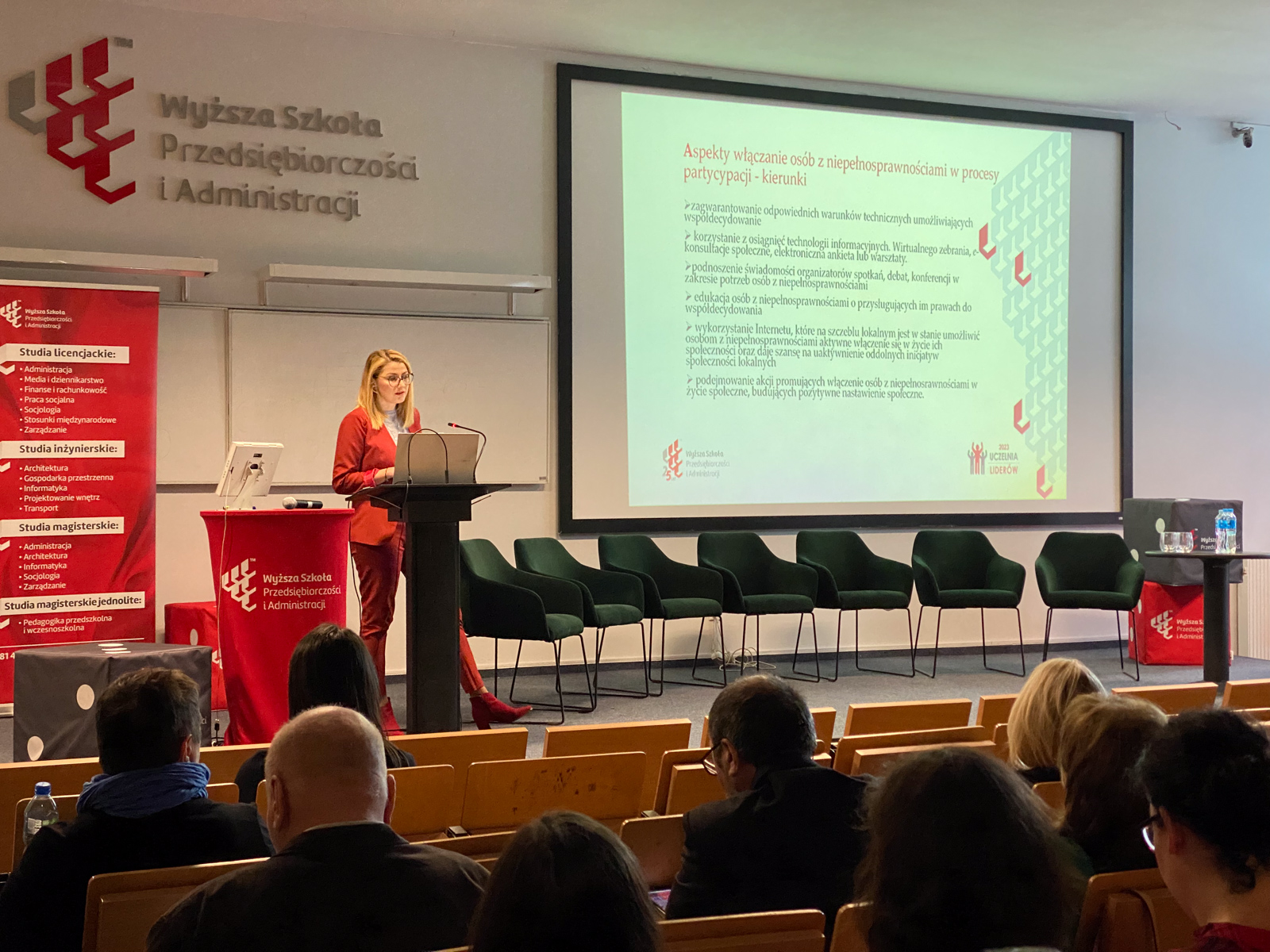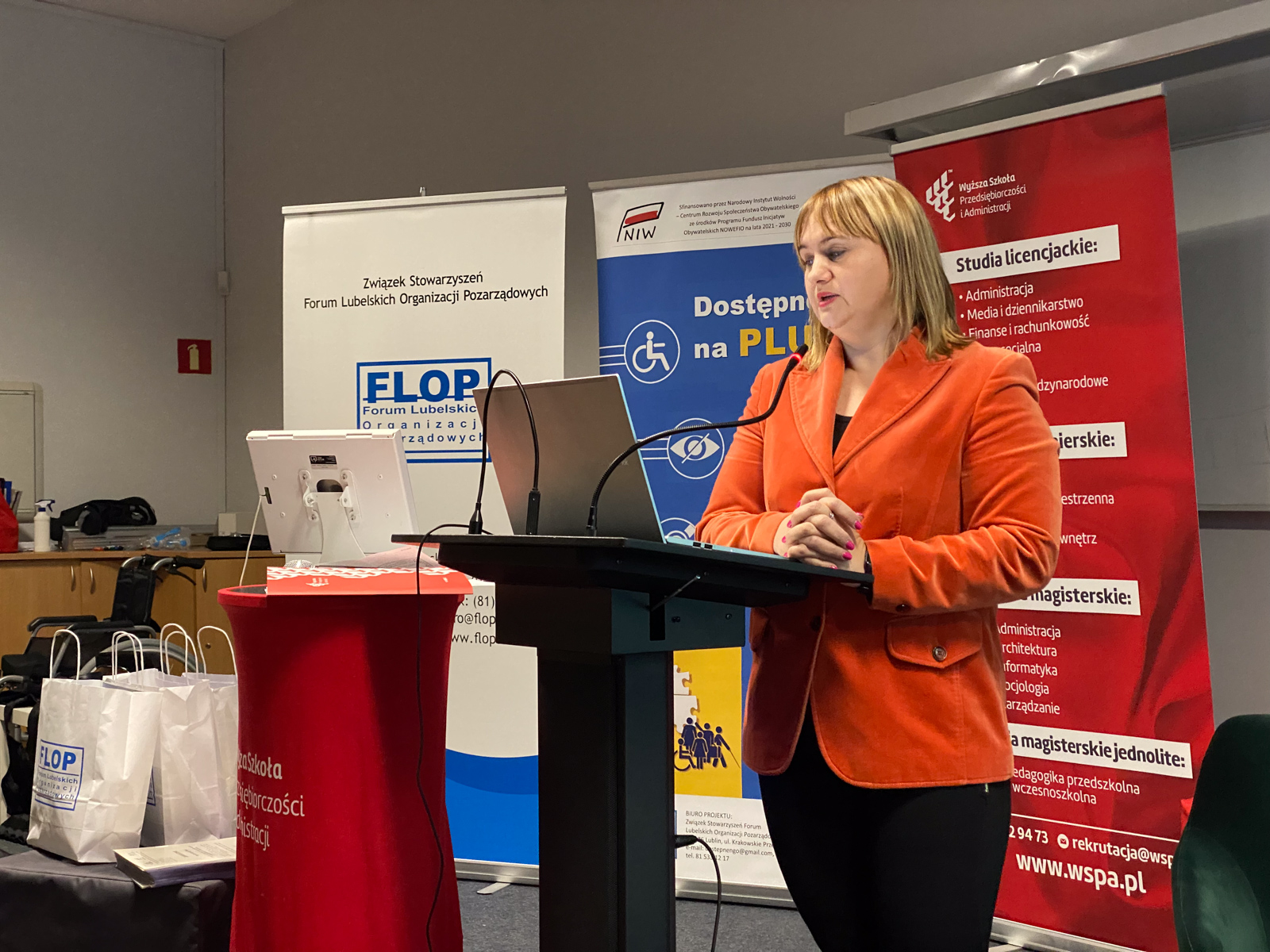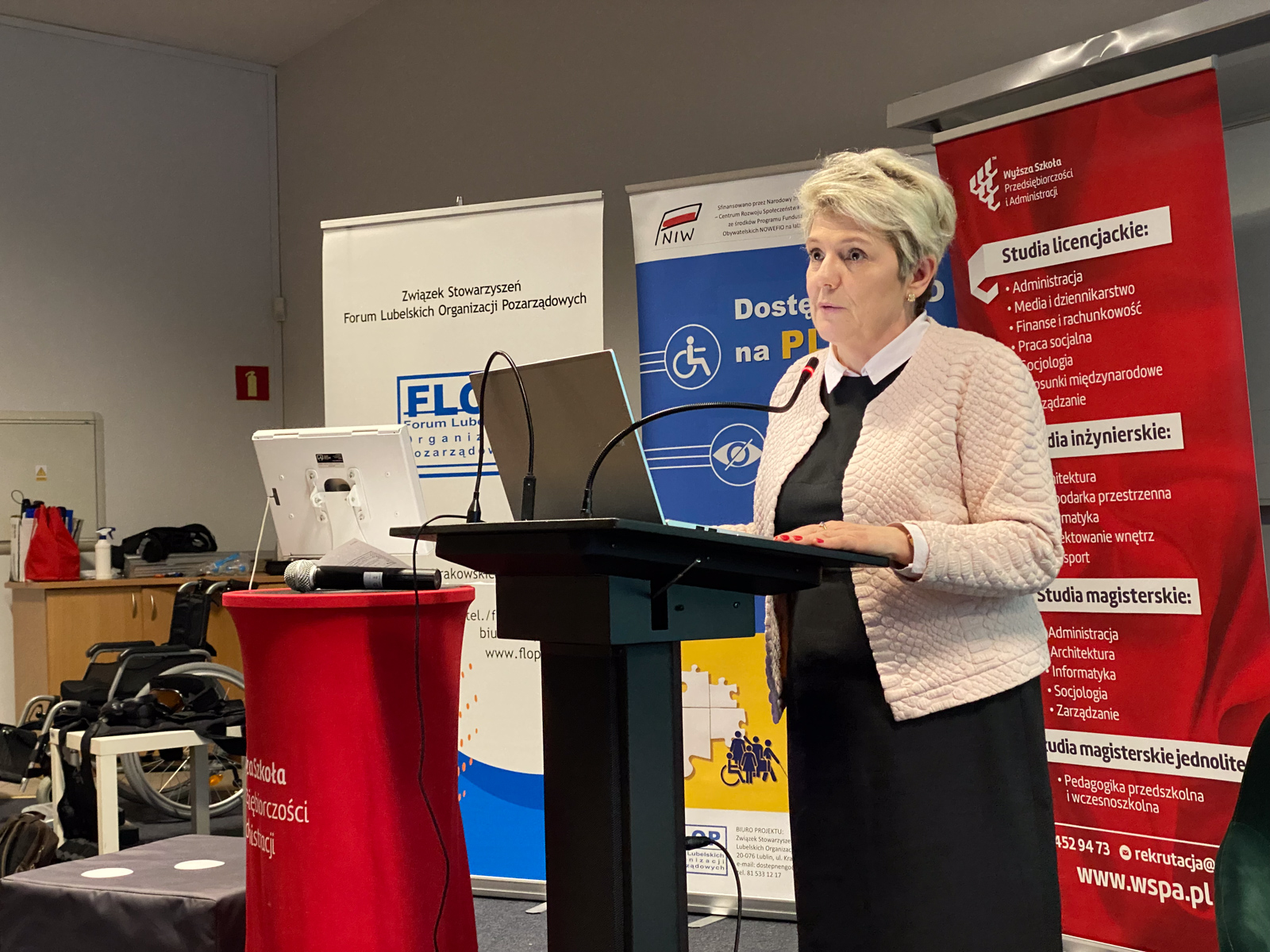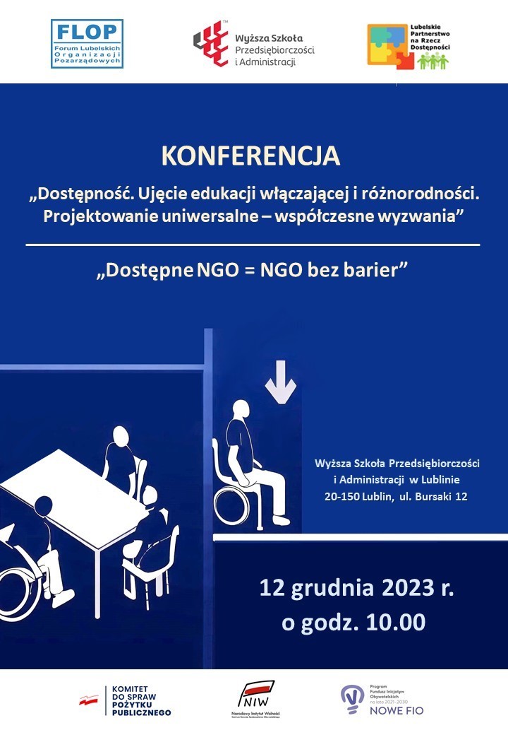 W dniu 12 grudnia 2023 r. w Wyższej Szkole Przedsiębiorczości i Administracji w Lublinie (WSPA) odbyła się regionalna konferencja „Dostępne NGO = NGO bez barier”, upowszechniająca wyniki projektu realizowanego przez Związek Stowarzyszeń Forum Lubelskich Organizacji Pozarządowych (FLOP) pt. „Dostępne NGO na PLUS”, sfinansowanego przez Narodowy Instytut Wolności – Centrum Rozwoju Społeczeństwa Obywatelskiego w ramach Rządowego Programu Fundusz Inicjatyw Obywatelskich NOWEFIO na lata 2021-2030. Celem projektu było wypracowanie, przetestowanie a następnie wdrożenie standardów w zakresie zapewniania przez NGO dostępności w swojej działalności. W ramach projektu powstały standardy „NGO bez barier – lubelskie standardy dostępności organizacji pozarządowych”. https://liderzydostepnosci.pl/standardy-ngo-bez-barier/