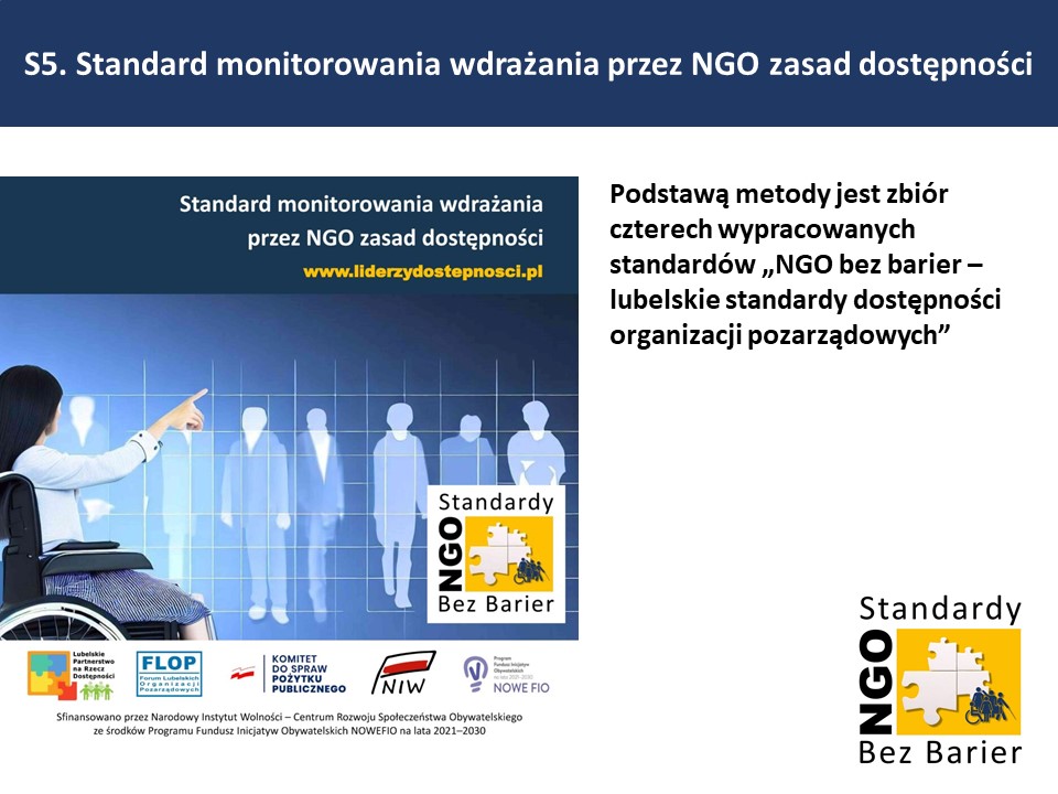 Dostępność jest jak mapa drogowa, która nie ma jednej drogi i nigdy się nie kończy. Potrzebne są standardy stanowiące drogowskaz, które wyznaczą kierunek i wskażą skuteczne rozwiązania związane z wdrażaniem dostępności. W tym zakresie standardy często wyprzedzają przepisy prawne oraz mają formę zaleceń. W wielu przypadkach standardy dostępności, dedykowane NGO, będą stawiały przed nimi wymagania wyższe niż te, które wynikają z aktualnych przepisów prawnych.