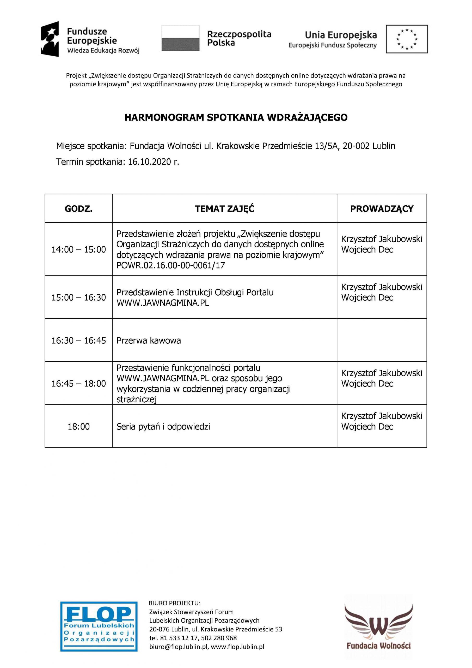 Portal www.JawnaGmina.pl został stworzony w ramach projektu pt. „Zwiększenie dostępu Organizacji Strażniczych do danych dostępnych online dotyczących wdrażania prawa na poziomie krajowym”, nr POWR.02.16.00-00-0061/17, współfinansowanego przez Unię Europejską w ramach Europejskiego Funduszu Społecznego. Projekt jest realizowany przez Związek Stowarzyszeń Forum Lubelskich Organizacji Pozarządowych w partnerstwie z Fundacją Wolności. Na spotkanie można przynieść wypełniony Formularz zgłoszeniowy i Oświadczenie lub wypełnić dokumenty na miejscu.