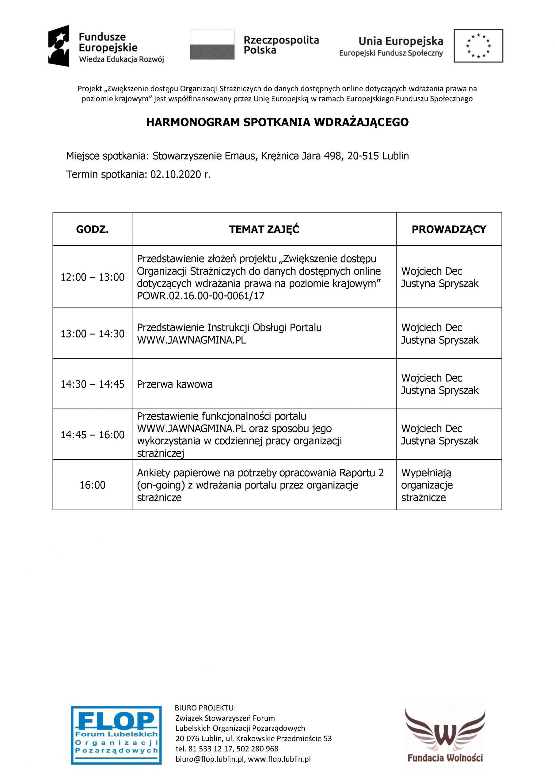 Portal www.JawnaGmina.pl został stworzony w ramach projektu pt. „Zwiększenie dostępu Organizacji Strażniczych do danych dostępnych online dotyczących wdrażania prawa na poziomie krajowym”, nr POWR.02.16.00-00-0061/17, współfinansowanego przez Unię Europejską w ramach Europejskiego Funduszu Społecznego. Projekt jest realizowany przez Związek Stowarzyszeń Forum Lubelskich Organizacji Pozarządowych w partnerstwie z Fundacją Wolności. Na spotkanie można przynieść wypełniony Formularz zgłoszeniowy i Oświadczenie lub wypełnić dokumenty na miejscu.